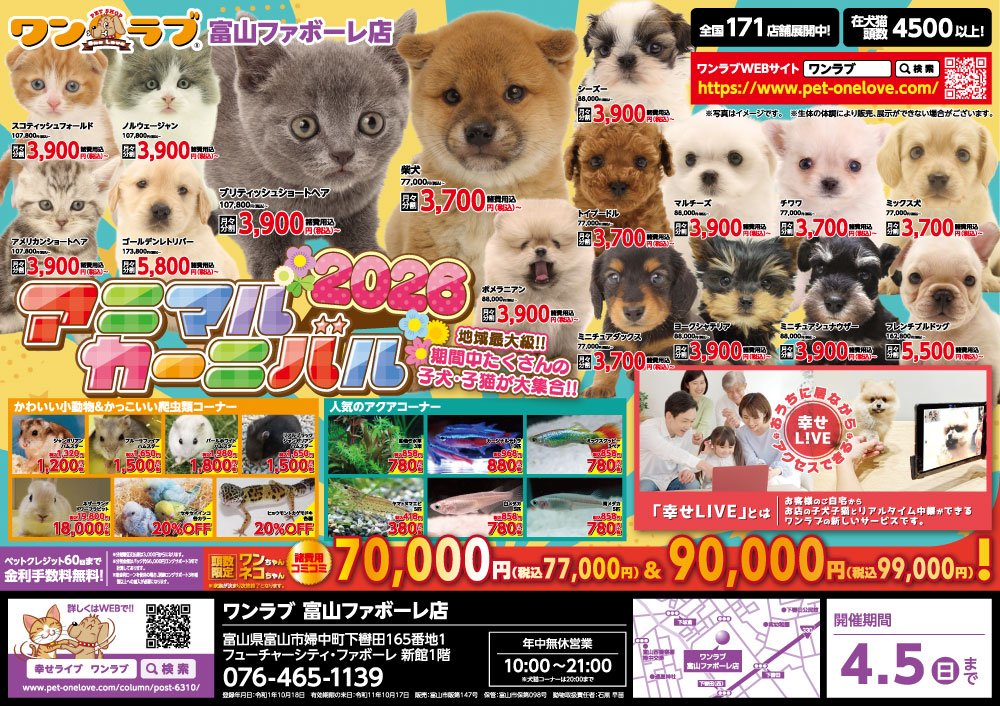 本年も大変お世話になりました!!(^^)/2026年も何卒よろしくお願い申し上げます。m(__)mワンラブの年納も、お得な催しが目白押しとなっております(^^♪更なるサービスの向上と、お客様に愛される店舗づくりをこれからも頑張ってまいります!!今年もお世話になりました!ワンラブからの感謝玉 年納イベントを開催させて頂きます (*´▽`*)子犬子猫、ペットたちと触れ合い、笑顔のある、あったかい毎日を過ごしていただきたい(*^-^*)ワンラブは元気な日本を応援します!!この期間中限りの大変お得なイベントとなっております(*^-^*)ワンラブ全店にて、イベント期間中 3,300円以上お買い物頂いた方を対象に、専用の応募用紙にて、総額150万円相当の豪華賞品の中から、お好きな商品を選んで抽選応募いただく事が出来ます!!そして!!所属店舗限定にて、ラブラブパック半額の子もいますよ~ ペットのお迎えがとってもチャンスなこの期間、ぜひ遊びに来てくださいね~♪スタッフ一同皆様のご来店、お待ち致しております(^^)/ https://www.pet-onelove.com/column/post-7698/