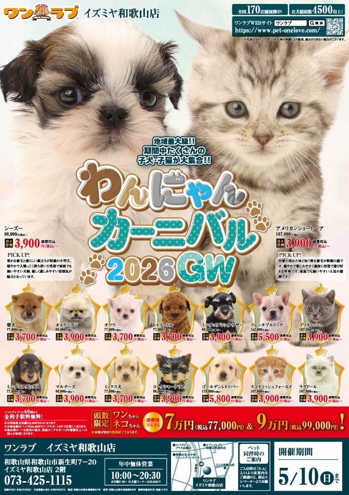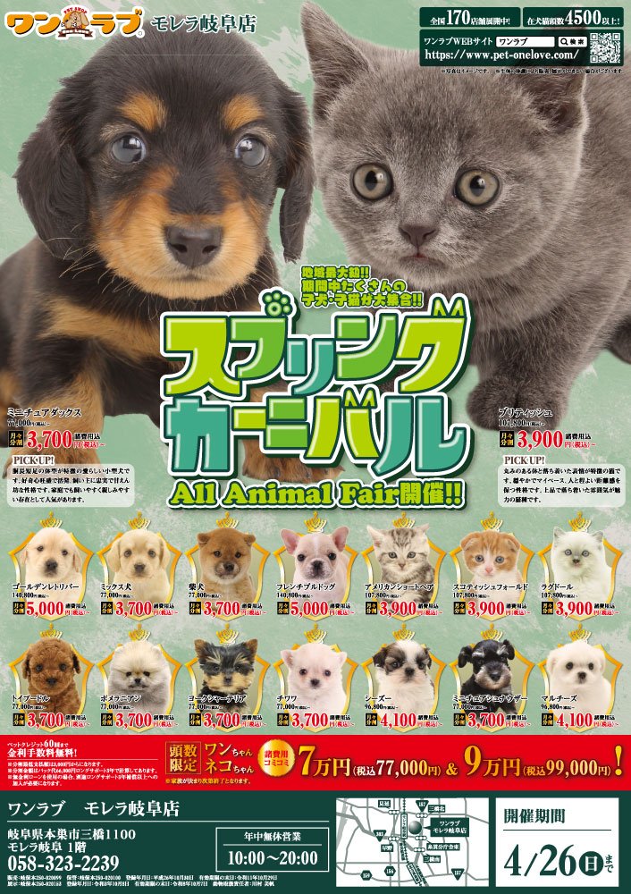 岐阜県の皆さま お世話になっております!!4月11日(土)より、ペットショップワンラブ モレラ岐阜店にてスプリングカーニバルを開催させて頂きます!!4/11~4/26までのイベント期間中(^^)/厳選されたかわいい子犬子猫が大集合!!かわいい子犬子猫が元気に遊びまわっておりますよ~ 気になったら子はぜひ抱っこしてあげてくださいね(^_-)-☆さらに限定頭数!特別なお迎え価格の子犬子猫もいますので、ぜひホームページでもご確認下さい♪ハムスター・ミニウサギや小鳥・アクアコーナーも元気で、爬虫類コーナーでは20%OFFになる子もいます!!ペットの事ならぜひご相談ください!ワンラブが全力でサポートさせていただきます(^^)/そして、4/11・12限定開催の金魚すくいコーナーも登場致します!!改めまして、地域の皆様に愛されるペットショップとしてスタッフ一同頑張ってまいりますm(__)m 絶対に損はしないお祭り期間となっておりますので、この機会にぜひ遊びに来てください(^^)/ ■モレラ岐阜店 在籍中の子はこちらhttps://www.pet-onelove.com/puppy/?shop=77■イベントチラシはこちらからhttps://www.pet-onelove.com/column/post-8503