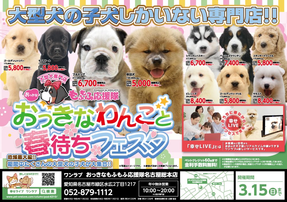 埼玉県のみなさま!今年もよろしくお願いします!!店舗イベントをご紹介です~2月7日(土)より、ペットショップ ワンラブ アリオ川口店にて、ハートフルウィンターフェスタを開催させていただきます!!ワンラブでは、大変お得なイベントが今年も盛り沢山となっております。2/7~2/23までのイベント期間中(^^)/厳選されたかわいい子犬子猫が大集合!!ペット用品も専門店として、品揃え豊富!!イベント特価となっております♪愛らしい子犬子猫が広々スペースで元気に遊びまわっておりますよ~ 気になった子はぜひ抱っこしてあげてくださいね(^_-)-☆イベント期間中30頭以上のかわいい子犬子猫が在籍しております!アクア・小動物コーナーも元気に営業中です!!ペットの事ならぜひご相談ください!ワンラブが全力でサポートさせていただきます(^^)/改めまして、地域の皆様に愛されるペットショップとしてスタッフ一同頑張ってまいりますm(__)m ■アリオ川口店 在籍中の子はこちらhttps://www.pet-onelove.com/puppy/?shop=33■イベントチラシはこちらからhttps://www.pet-onelove.com/column/post-7808